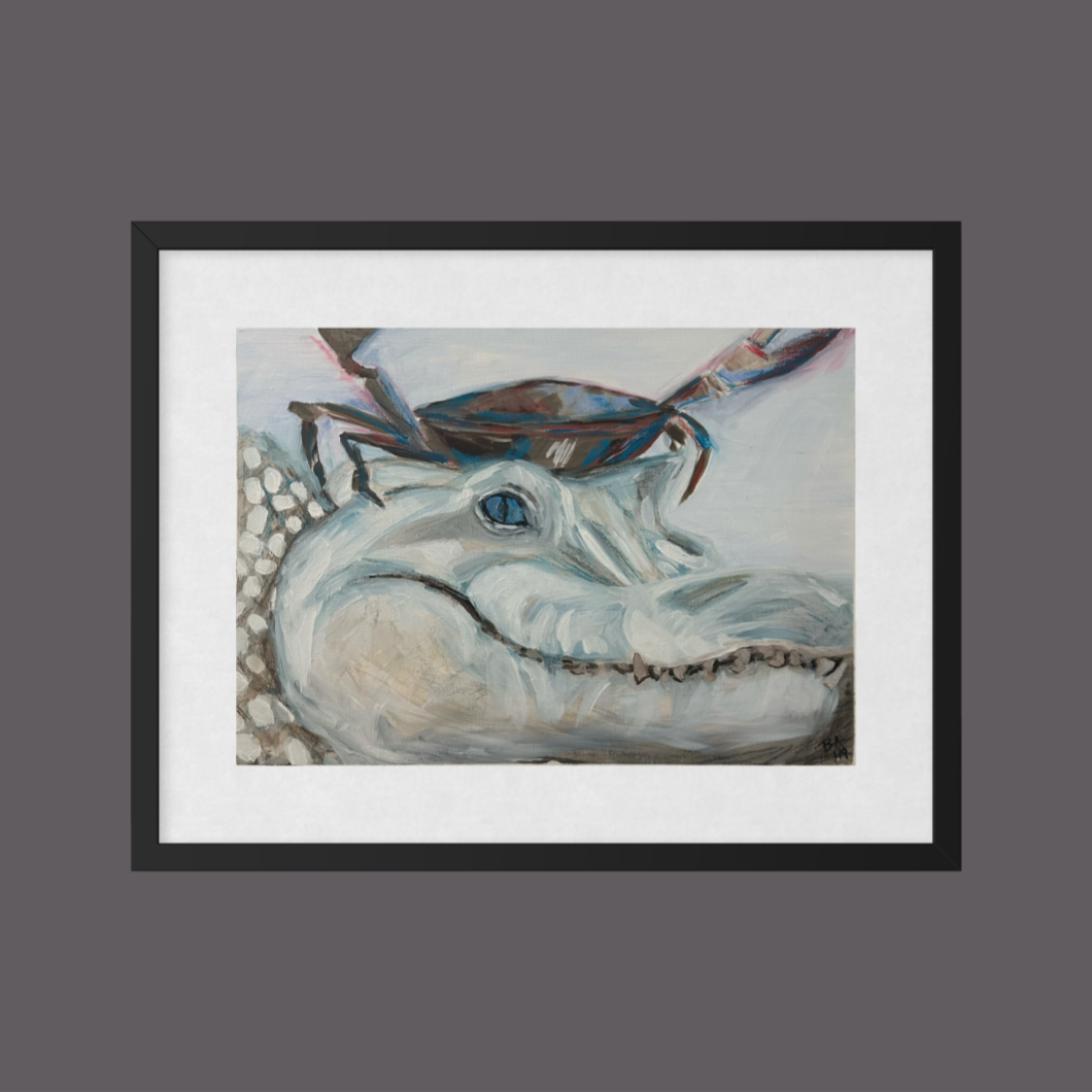 Being from Louisiana, I’m just fascinated by alligators. They are so still and quiet and so dangerous at the same time. I saw a photograph of some crocs with butterflies perched on their heads and wanted to paint alligators with random small creatures perched on their heads.